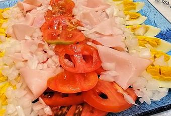 Montar la ensalada de tomate y huevo, en una fuente o platos individuales, con los ingredientes preparados y el fiambre elegido.