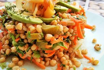 - Rallamos la zanahoria y cortamos las demás verduras en trozos. En un bol mezclamos el trigo con las verduras, salpimentamos y aliñamos. Mezclamos bien y servimos.