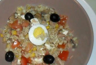 En una ensaladera vamos incorporando el resto de los ingredientes de la ensalada. Escurrimos bien el bonito, lo troceamos y lo echamos en la ensaladera. Añadimos el maíz dulce. Lavamos y troceamos los tomates en cuadraditos no muy grandes y los incorporamos. Troceamos el queso feta en dados y los añadimos. Echamos las aceitunas negras sin hueso e incorporamos el trigo tierno con los champiñones. Cortamos en rodajas los huevos que habremos cocido previamente y se los agregamos.