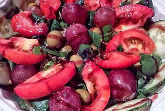 1/2 bolsa de Canónigos1 tomateaceitunas verdesuvas de la clase que más os gusteaceite de olivacrema de vinagre de Jerez1/2 pepino