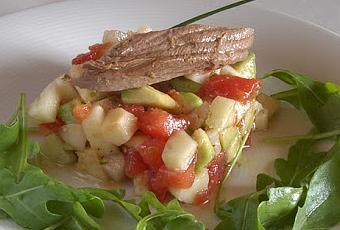 verduras que utilizamos.Ingredientes para cuatro personas 150 gr (2 latas) de ventresca de bonito en aceite de oliva Dos tomates maduros Un pepino Un aguacate Una manzana Cuatro rabanitos Una cucharada de cebollino picado Cuatro clavos de olor Dos nueces Un limón Aceite de oliva Reducción de vinagre de jerez Sal Una bolsa de hojas de rúcula
