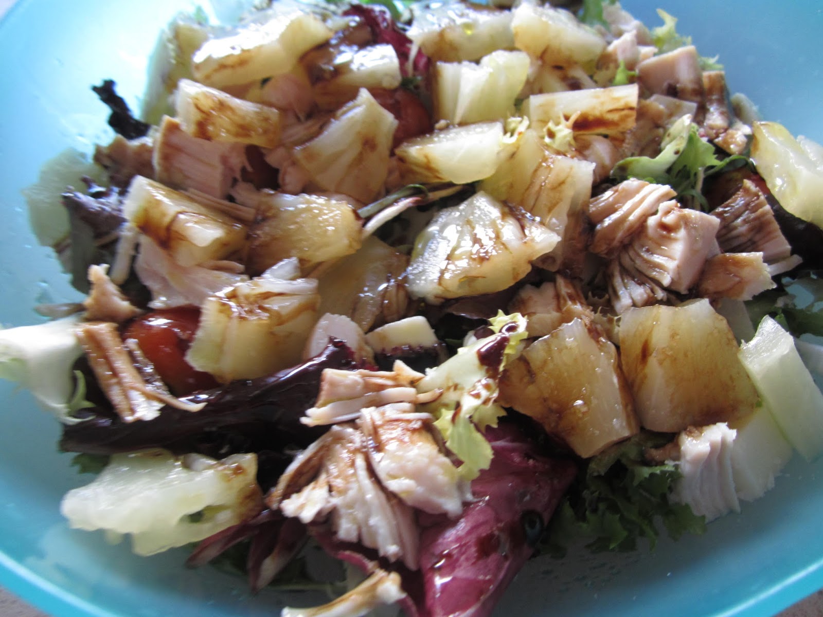 INGREDIENTES:Mezcla de lechugas.Piña natural a trocitos.Pechuga de pollo matachínTomates cherries.PREPARACIÓN:¿Qué difícil es hacer una ensalada?Poner todos los ingredientes en un bol y aliñar con nuestro aliño favorito. En este caso solo añadimos aceite de oliva y vinagre de Módena.