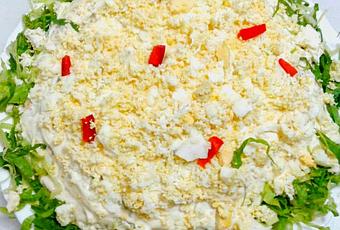 Elaboración:Hervir la merluza y la patata juntas, escurrir y picar después con el tenedor. Sofreir las colas de gamba con un poco de aceite. Cortar la lechuga bien pequeña así como el resto de los ingredientes y mezclar todo. Añadir la mayonesa, cantidad a vuestro gusto.Colocar sobre una fuente y a adornar con mayonesa, lechuga y huevo duro.