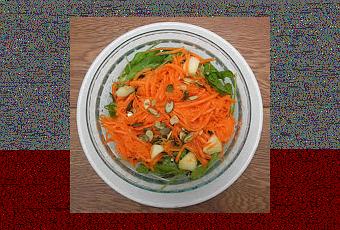Lavar y cepillar las zanahorias. Pelar si es necesario, y luego rallarlas.Poner en una fuente, la lechuga, la rúcula, zanahoria rallada y maní. Mezclar.