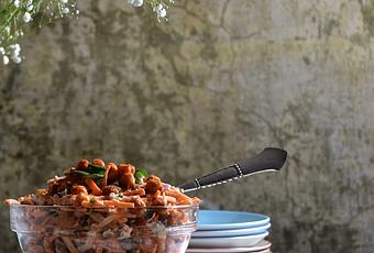 - En un cuenco grande, mezclamos enérgicamente las zanahorias junto con la cebolla, el perejil y las pasas. Salpimentamos e incorporamos el aliño de tahini. Removemos bien y servimos con los garbanzos tostados por encima.