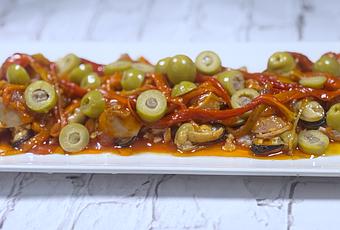 - Encima de esta se pone el atún, los mejillones y los calamares rellenos cortados en rodajas.