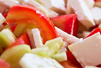 - Lavamos el tomate lo secamos y cortamos en rodajas. Quitamos también la cáscara al queso y lo cortamos en dados del mismo tamaño que la fruta. Los acomodamos sobre la lechuga.