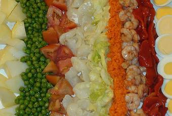 Pondremos la patata y los guisantes en dos cuencos diferentes mezclados con aceite de oliva vírgen. El tomate cortado a trozos, el bacalao, la lechuga, la zanahoria y el pimiento asado en otros cuencos mezclándolos con sal, aceite de oliva vírgen y vinagre. Las gambitas en otro cuenco con aceite de ajo (triturar 100ml de aceite de oliva con un diente de ajo y perejil fresco).