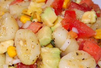 500gr. de gnoccis 2 tomates 1 cebolla dulce 1 lata pequeña de maíz dulce 1 aguacate grande 70gr. de margarina o mantequilla 5 hojas de salvia fresca Sal y salvia seca