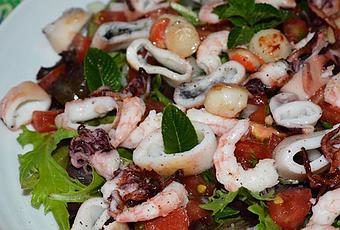 Una bolsa de brotes tiernos (canónigos, brotes de lechuga roja, lechuga verde, etc. )400 gr de calamares pequeños frescos400 gr de camarones1 bandeja de concha fina (8 unidades)1 cebolla pequeña1 tomatecilantro, mentaaceite de oliva virgen extra, sal, pimientazumo de limónPreparación: