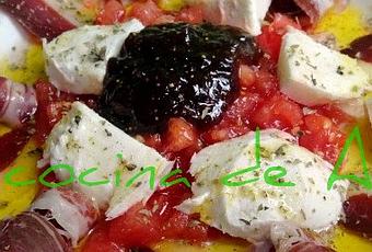 - Poner encima del tomate una cuch. de mermelada de cebolla (o higos), y rociar todo con aceite de oliva virgen extra.