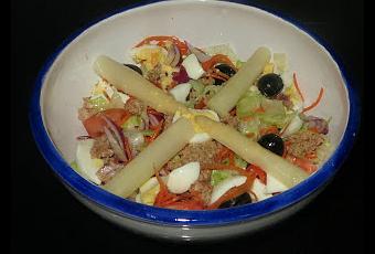 Elaboración:Lo primero que hacéis es lavar bien la lechuga, la secáis y la cortáis en trozos pequeños, lo mismo hacéis con el tomate. Esto será la base de nuestra ensalada, ahora añadís la zanahoria rallada, las aceitunas, la cebolla cortada en juliana, la lata de atún bien escurrida y el huevo duro picado y por último colocáis los espárragos para decorar. Saláis y le echáis aceite y vinagre al gusto y ya está lista para servir.