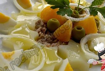 Antes de nada decirte, que cuando hago esta ensalada, no la presento así, ni mucho menos, vamos..!! jajajajaLa presentación está echa así, pa la fotito, porque queda más kuki... O no..?? Ea, pues yastá...Hay muchas versiones de ensalada malagueña.. Normalmente se hace con bacalao desalado, pero a mí no me gusta.