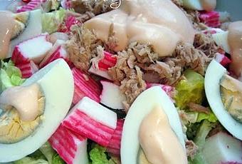 Otra ensalada fácil y deliciosa para este calor que todavía hace. En esta ocasión le voy a dedicar esta receta a Magic of Spice (The Ardent Epicure) por el premio "Beautiful Blogger" que me ha otorgado. Gracias y feliz semana a tod@s!- Poner en un bol lechuga picada, palitos de cangrejo, gambas peladas y cocidas, atún en aceite escurrido y huevo cocido cortado a cuartos. Cubrir con salsa rosa y servir.