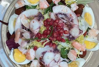 Esta ensalada mixta de pulpo y gambas con granada es una ensalada muy otoñal y con una mezcla de sabores que te va a encantar.INGREDIENTES:Mezcla de ensaladas y brotes tiernos.Escarola.2 huevos duros.Tomates cherris.2 o 3 champiñones crudos.Media granada.12 gambas.1 pata de de pulpo cocido y cortada como si fuera para carpaccio.Aceite de oliva suave.
