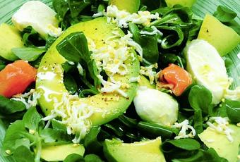 En la ensaladera, preparamos una buena ensalada de canónigos que acompañamos con queso, salmón y aguacate. Salpimentamos, un toque de eneldo y aceite.