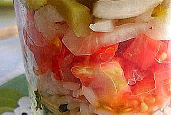 - Encima el arroz, el tomate, el pepinillo, la cebolleta y el salmón en trozos.