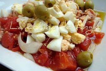 Con esta rica ensalada participo en la repesca del recetario mañoso de este mes, dedicado al aceite de oliva virgen extra. Ideal para un día tan caluroso como el de hoy.- Poner en una fuente tomate pelado en conserva (lata de 400 grs.), una lata de atún en aceite de oliva, unas aceitunas negras o verdes, 1 cebolleta cortada en juliana y 1 huevo cocido y picado. Salar y echar un buen chorro de aceite de oliva virgen extra.