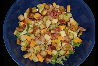 Ingredientes:- ½ bolsa de lechugas variadas.- 4 lonchas de bacon.- Un puñado de picatostes.- 50 gramos de queso cheddar.- 50 gramos de queso gouda.- Un puñado de cebolla frita.- Aceite de oliva virgen extra.- Sal.- Vinagre de Módena y una cucharadita de miel.Elaboración:Colocamos la lechuga en el bol donde vayamos a servir la ensalada. En una sartén sin aceite pasamos el bacon hasta que lo tenemos bien frito. En esta misma sartén con un poco más de aceite hacemos los picatostes, es decir, cogemos un par de rebanadas de pan las cortamos en cuadraditos y las pasamos por esta sartén hasta que hayan cogido color.Ahora echamos los picatostes en el bol de la ensalada, si nos hemos pasado con el aceite los escurrimos antes, también añadimos el bacon cortado en trozos, así como el queso y la cebolla frita.A continuación, realizamos el aliño con el aceite, la sal, el vinagre y la miel y se lo echamos por encima y ya está lista para servir.