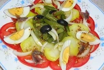 Ingredientes:4 patatas medianas300 gr de judías verdes3 tomates madurosaceitunas1 cebolletaanchoas (1 por persona)2 huevos cocidosaceite de girasolmostazavinagre sal