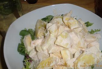 Mezclamos las manzanas, las patatas y el apio con la salsa.