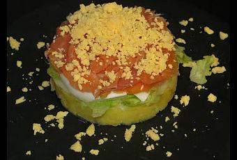 Una vez tenemos peladas las patatas y machacadas o picadas y la clara del huevo, montamos la ensalada.Colocamos un aro para emplatar, ponemos la primera capa de patata, luego cebolla y aliñamos con un poco de sal y aceite, la siguiente capa será de huevo, lechuga y salmón ahumado y coronamos con la yema rallada.
