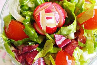 Ingredientes: Ensalada hoja de roble Achicoria Cebolla tierna Tomates cherry Aceitunas verdes Pepino Rábano