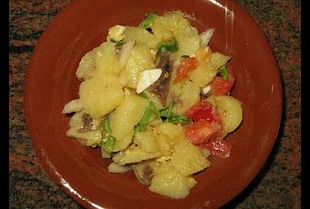 Una vez lo tenéis cocido, lo cortáis en trozos y los ponéis en la ensaladera. Añadís la cebolla, el tomate, el pimiento verde y las anchoas bien escurridas. Echáis un par de chorros generosos de aceite y vinagre, saláis y ya está lista para servir.