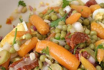 Para 5 ó 6 porciones grandesnecesitamos....- Un pote o lata de 800 gr. de petits pois con zanahorias (pitipua´...XD) ahora practico mi francés y me pego la fantasmada del año (petits pois carottes á l´étuvée) ó sustituir por 100 gr. de arvejas tiernas cocidas y 2 zanahorias grandes cocidas y cortada en cubos .