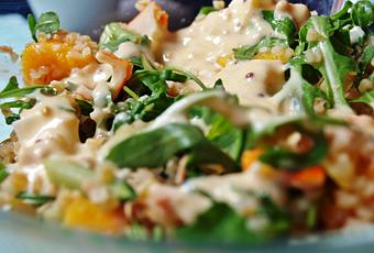 Montamos la ensalada, repartimos el bulgur, un puñado de rúcula y el resto de ingredientes al gusto.