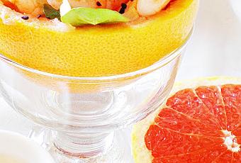 Rellenar los pomelos vaciados con las endibias, el pomelo troceado, las gambas y los berros.