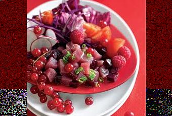 INGREDIENTES PARA 4:•200 grs de atún fresco•100 grs de col lombarda•1 remolacha•1 achicoria•8 rabanitos rojos•8 tomatitos cherry•1 barquilla de frambuesas•1 barquilla de grosellas•Mermelada de cerezas•Vinagre de jerez•Aceite de oliva•Sal•Pimienta