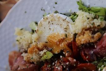 LechugaQueso de cabraJamón SerranoCuscúsTomatitos secosVinagreta de Aceite de Oliva y Vinagre BalsámicoOréganoAlbahaca