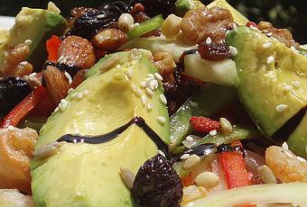Cuando emplatemos vamos combinando los colores, para hacer un plato vistozo. Añadimos las gambas. En un sartén cubierta con aceite de oliva, salteamos todos los frutos secos, añadimos un poco de vinagre y dejamos llevar a ebullición. Retiramos y con ayuda de una cuchara vamos echando sobre la ensalada que habíamos preparado, servir en el mismo momento.