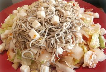 Cortamos la lechuga y la dejamos con un recipiente en agua, hacemos lo mismo con la cebolla. Lo escurrimos y ponemos en un bowl. Agregamos el tomate pelado y cortado,los tacos de queso y picatostes. Ponemos una sartén con aceite y agregamos los ajos tiernos hasta que estén dorados y así el aceite habrá cogido el gusto del ajo, ahora ponemos las gulas hasta que estén hechas y seguidamente vertemos en el bowl donde está ya todo listo las gulas y el aceite. Para terminar el aliño de la ensalada le ponemos vinagre de módena a nuestro gusto.