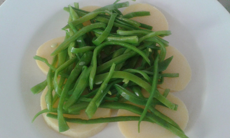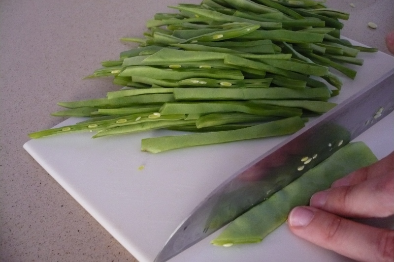 Cortamos las judías planas en finas tiras, las coceremos ligeramente y así conservarán su tersura y su color verde intenso.