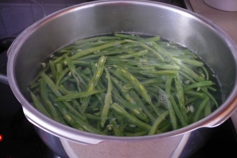 Mientras cortamos las judías y le quitamos el rabito, ponemos agua a calentar en otra olla. Cuando el agua rompa a hervir, añadimos una cucharadita de sal y echamos las judías.