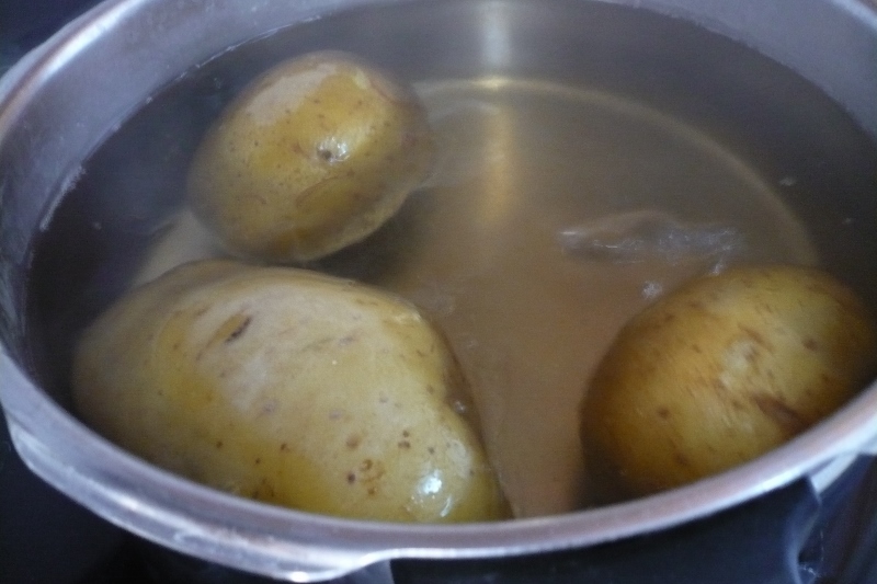 Cocemos las patatas en agua con sal. Cuando hierva el agua, bajamos a fuego medio y dejamos cocer durante unos 30 minutos. Ponemos en otro cazo los huevos para hacerlos duros (10 minutos de cocción desde que rompa el hervor).