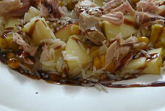 Calentamos 1 minuto el vaso de arroz en el microondas, mientras cortamos el ajo en trozos muy pequeños y lo ponemos en una sartén con un poco de aceite. Cortamos las manzanas en cuadrados. Cuando el ajo este dorado,añadimos el arroz, las manzanas y el maíz.Damos unas vueltas y los tenemos al fuego un par de minutos. Lo ponemos en el plato donde lo vayamos a servir y ponemos el atún por encima. Ya solo nos falta echar la crema balsámica y listo.