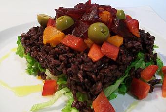 INGREDIENTES (2 personas)170 g de arroz negro1 rodaja gruesa de calabaza1 remolachaLechuga1/2 pimiento rojoAceitunasPARA LA VINAGRETA:Aceite de oliva virgen extraSal marina atlánticaEl zumo de 1/2 naranjaUn chorrito de vinagre de manzanaPREPARACIÓNDejamos en remojo el arroz toda la noche. Escurrimos y cocinamos. En nuestra olla exprés tarda unos 30 minutos.Pelamos y lavamos la calabaza y la cortamos en trozos no muy grandes. La cocinamos al vapor y dejamos que se temple.En un bol, mezclamos el arroz escurrido y la calabaza. Añadimos la remolacha rallada, el pimiento picadito y las aceitunas fileteadas. Mezclamos los ingredientes de la vinagreta y aliñamos