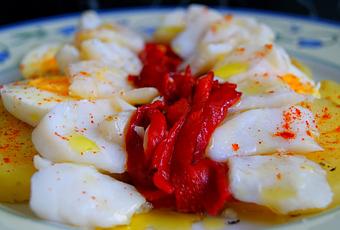 Siguiendo con el emplatado, colocaremos los pimientos rojos en medio, entre las patatas y el huevo, y a sus costados iremos colocando las lascas de bacalao. Condimentaremos el conjunto con pimentón al gusto y aliñaremos con aceite de oliva. Serviremos la ensalada templada.