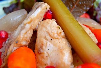 A la hora de montar la ensalada, escurrimos la lechuga la partimos y la colocamos en la mitad del plato. Pelamos la patata, la cortamos en rodajas y la colocamos en la otra mitad del plato. La salpimentamos. Encima de la patata, formamos una piramide con el chicharro escabechado y las verduritas, la zanahoria, el puerro y la cebolla. Colocamos también los tomates cherry y espolvoreamos la granada por encima. Salpimentamos toda la ensalada y con unas cucharadas de escabeche aliñamos toda la ensalada.