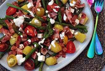 Una vez hervidas las verduras, se cuelan bien. Lo ponemos en un plato de presentación, agregamos los tomates cortados a la mitad, el queso, la panceta y aliñamos.