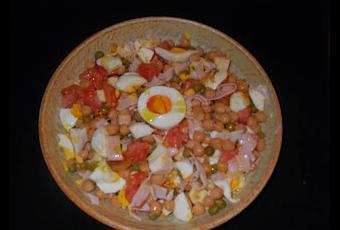 Elaboración:Podéis utilizar un bote de garbanzos ya cocidos, ponerlos a cocer vosotros mismos o usar los del cocido. Si decidís utilizar los de bote darles un agua para que se les vaya el sabor, si usáis los del cocido no tenéis que hacer nada, mientras que si queréis cocerlos vosotros mismos, no olvidéis que la noche anterior los tenéis que poner en remojo cubiertos de agua en un lugar fresco. Al día siguiente pones una cacerola con abundante agua y un poco de sal y cuando empiece a cocer le añades los garbanzos y bajas el fuego. Si es una olla normal suelen tardar unas dos horas, aunque para eso lo mejor es probarlos y ver cuando están listos; para la ensalada lo mejor es que queden un poco duros. Una vez estén en su punto, hay quitarles el agua y pasarlos por debajo del grifo.Una vez que están listos los garbanzos, si queremos hacer la ensalada templada, colocamos una sartén y en ella echamos los garbanzos y los guisantes y los dejamos simplemente un par de minutos para que estén templados a la hora de servir la ensalada.Mientras tanto ponemos otro cazo a cocer con agua y sal para los huevos. Una vez que el agua esté cociendo echamos los huevos y los dejamos diez minutos. Cuando los huevos están cocidos, los pelamos y los cortamos en pequeños trozos, al igual que el tomate, el pavo y los quesitos. Añadimos todos los ingredientes a la ensaladera, salamos y aliñamos con aceite y vinagre y ya está lista para degustar.