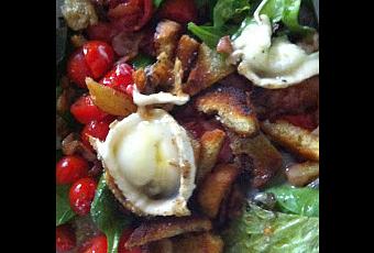En un plato ponemos un puñado de lechuga variadas , los tomates cherrys cortados por la mitad , las tiras de bacon , los picatostes y por encima las rodajas de queso de cabra .