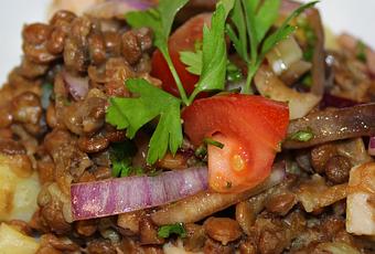 250gr LentejasPavo Perejil250gr Patatas cocidas½ Cebolla roja1 TomateSalAceite de olivaYVinagre de MódenaLo primero que vamos a hacer cocer las lentejas que hemos tenido en remojos desde el dia antes o si son precocinadas las lentejas escurrirlas con agua fría. Cortamos la cebolla roja en tiras finas, el tomate en dados y lo añadimos en bol. Mezclamos los ingredientes, echamos 3 cucharadas de aceite de oliva, ½ cucharada de vinagre de Modena, 2 cucharadas perejil picado y volvemos a mezclarlo.Ahora cogemos una sartén doramos el pavo con muy poco aceite para que se quede marcado el exterior y añadimos las patatas cocidas en tacos. (Os recomiendo patatas de tipo Agata).Incorporamos las lentejas a la sartén y lo rehogamos un poco.Emplatamos con todos los ingredientes.