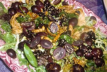 Ponemos la mezcla de ensalada gourmet en una fuente, ponemos por encima el pollo con su jugo y distribuimos las uvas partidas por la mitad y las semillas de sésamo.