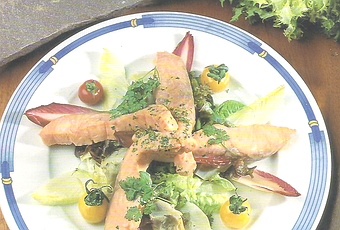 Se colocan las lonchas de salmon encima de la ensalada. Se echa por encima el aliño que a servido para marinar el salmon y unas gotas de vinagre.