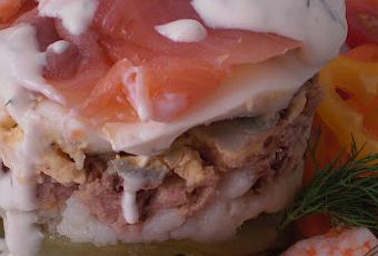 Emplatar a continuación:Colocar un molde en el centro del plato, metiendo dentro las habichuelas verdes, a continuación el puré de patatas, seguidamente atún al que previamente le hemos quitado el aceite donde se conserva.Colocar a continuación el huevo duro y justo encima el salmón y algunos langostinos.Alrededor del timbal, los trozos de pimientos, los tomatitos, el resto de los langostinos.Quitar con cuidado el molde y regar generosamente con la salsa…..adornando el conjunto con una ramita de eneldo…..