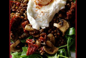 Ingredientes: 150 g lentejas cocidas; 200 g champiñones; 2 chalotas; 7 tomates secos (en aceite); 75 g rúcola; 2 huevos; aceite; vinagre; sal; pimienta, tomillo fresco; pimentón picante.